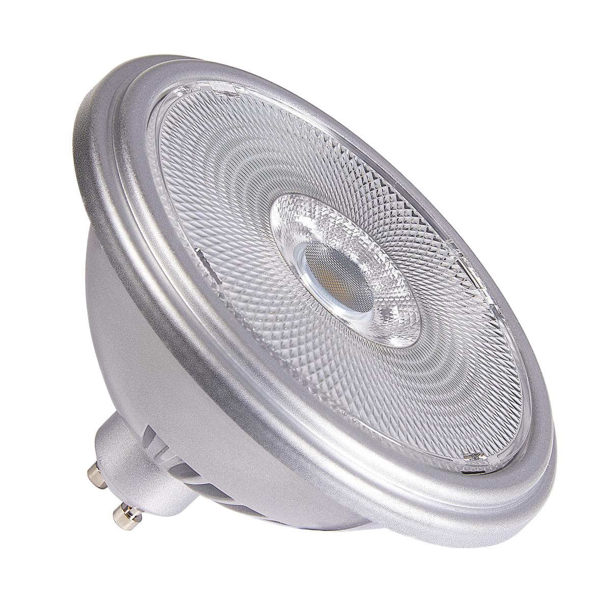 Das silberne 12,5 W SLV LED Filament Leuchtmittel mit GU10 Sockel und QPAR111 Form ist dimmbar, hat einen einen CRI -Wert von 90, 950 Lumen sowie eine Lebensdauer von 15.000 Stunden. Diese Version hat einen Abstrahlwinkel von 30° und ist warmweiss mit 2.700 Kelvin.