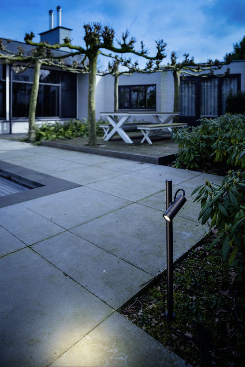 Mit ihrem minimalistischen Design und der schwarzen Oberfläche passt sich die HELIA SLIM Stehleuchte ganz natürlich in jede Außenumgebung ein. Während das warmweiße Licht (3000 K) eine besonders behagliche Atmosphäre ausstrahlt, macht die hochwertige Beschichtung den langlebigen Einsatz (L70B50, 50.000h) auch in Küstennähe möglich. Dabei lässt sich der Standort der mit 6 W-Leuchtenköpfen und 38°-Optik ausgestatten Pollerleuchte dank des 1,5 m langen Kabels mit Schuco-Stecker (IP44) ganz unkompliziert variieren.