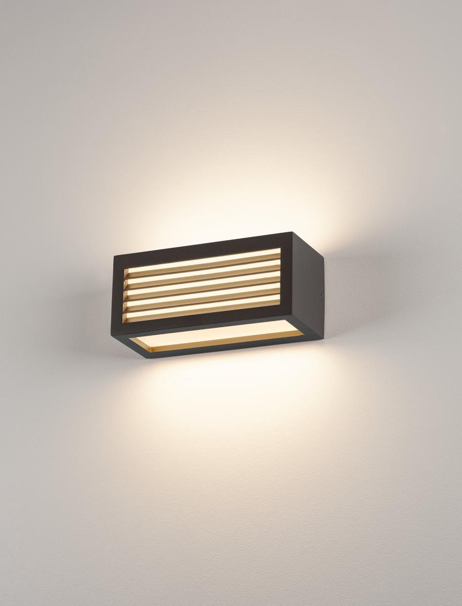 Einflammige Wandleuchte BOX-L bestehend aus lackiertem Aluminium und satiniertem Acryl welches die drei Lichtauslässe abdeckt. Durch Schutzart IP44 für den Außenbereich geeignet. Der elektrische Anschluss der in mehreren Farbversionen verfügbaren Leuchte erfolgt direkt an 230V Netzspannung.