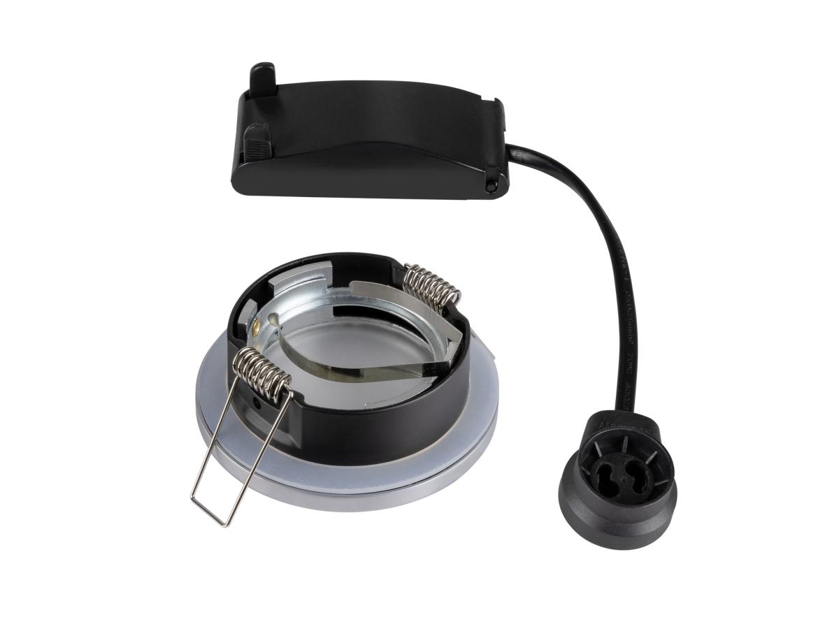 Der DOLIX OUT Hochvolt Deckeneinbauring ist aus Aluminium gefertigt und mit einem Glas zum Schutz gegen Spritzwasser ausgestattet. Mit seiner Schutzart IP65 ist er im Außenbereich oder in Feuchträumen einsetzbar. Dank der eingebauten GU10 Hochvoltfassung ist der DOLIX OUT Deckeneinbauring fertig für den direkten Anschluss an 230V Netzspannung.