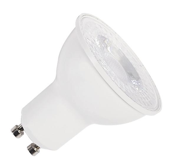 Das weiße 6 W SLV LED Leuchtmittel mit GU10 Sockel und QPAR51 Form ist dimmbar über Phasenanschnittsdimmer, hat einen einen CRI -Wert von größer 90, 460 Lumen sowie eine Lebensdauer von 25.000 Stunden. Diese Version hat 2.700 Kelvin.