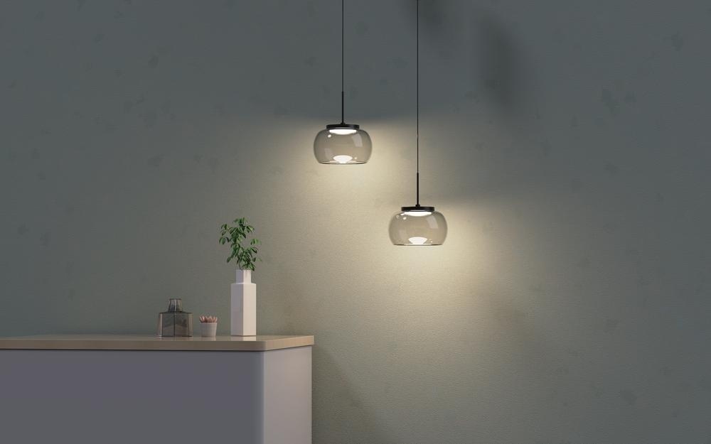 Die Pendelleuchte Bounto P verfügt über einen einzigen Leuchtenkopf mit Easy-Lift-System und Dim-to-Warm-Funktion und liefert 7 W energieeffiziente Beleuchtung.