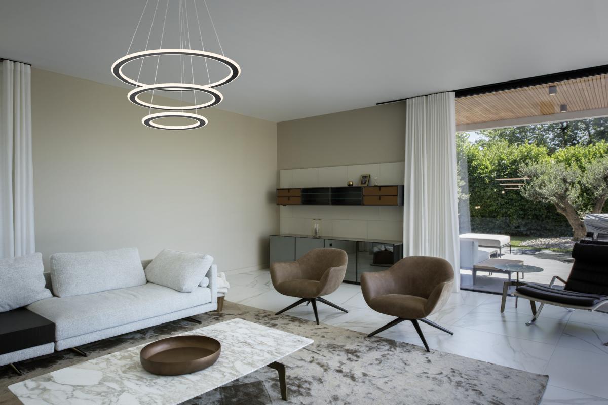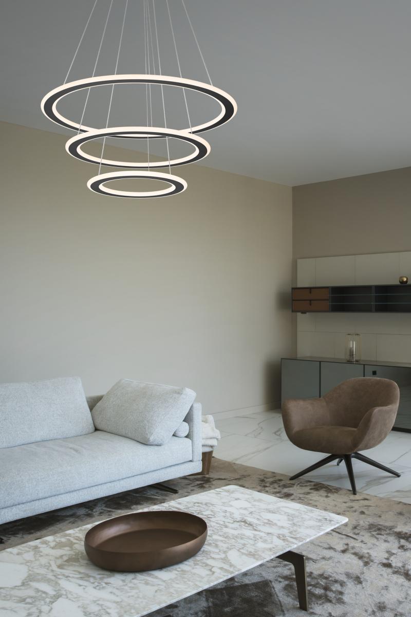 Dreimal Ring frei für eine neue, runde Designvariante: Die ONE FLAT Pendelleuchte erweitert die beliebte SLV Leuchtenfamilie um ein weiteres mit drei flachen Leuchtringen gesegnetes Mitglied, das neue Leistung verspricht. So verströmen die Premium LEDs ein DALI-dimmbares, via CCT-Switch in der Farbtemperatur verstellbares Licht (2700/3000 K), das farbneutral (CRI >90) und mit 50.000 Stunden äußerst langlebig ist. Einfach ideal für gehobene private Wohnräume oder den gewerblichen Bereich. Einfach ein rundes Erlebnis in Sachen Licht.