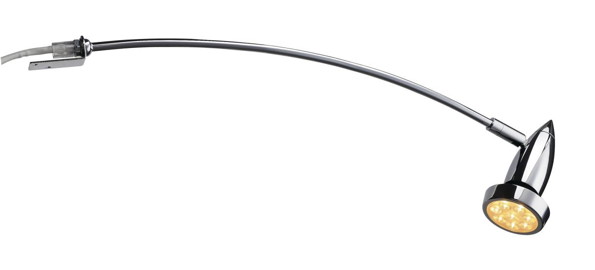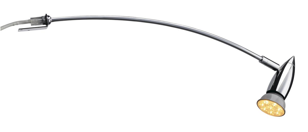 Dreh- und schwenkbare Hochvolt-Displayleuchte DISPLAY bei der Montagebügel und Kopf über einen gebogenen Ausleger verbunden sind. Durch den montierten GU10 Sockel ist die individuell mit LED- oder Halogenleuchtmittel bestückbare Leuchte für viele Anwendungen geeignet. Der elektrische Anschluss der Leuchte erfolgt durch die Zuleitung sowie Anschlussbox direkt an 230V Netzspannung.
