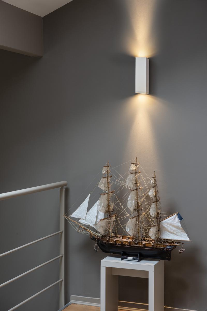 Die Wandaufbauleuchte THEO ist aus Aluminium gefertigt. Dank der Position der zwei verbauten Fassungen, erzeugt die montierte Leuchte zwei gleiche, jedoch entgegengesetzte Lichtkegel (UP/DOWN) der zum Einsatz gebrachten Hochvolt Halogenleuchtmittel des Typs GU10. Der elektrische Anschluss der in drei Farbversionen verfügbaren Leuchte erfolgt an 230V Netzspannung.