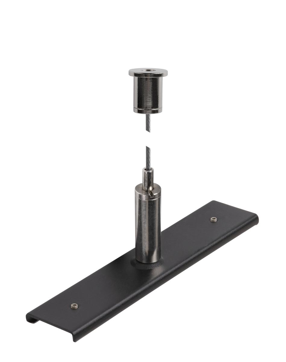Die Schienenverstärkungsplatte mit Aufhängungsset dient als Stabilisator und Verbindungsverstärkung bei der Montage mehrerer 48V TRACK Schienen, die über die drei Meter lange Drahtseilabhängung installiert sind.