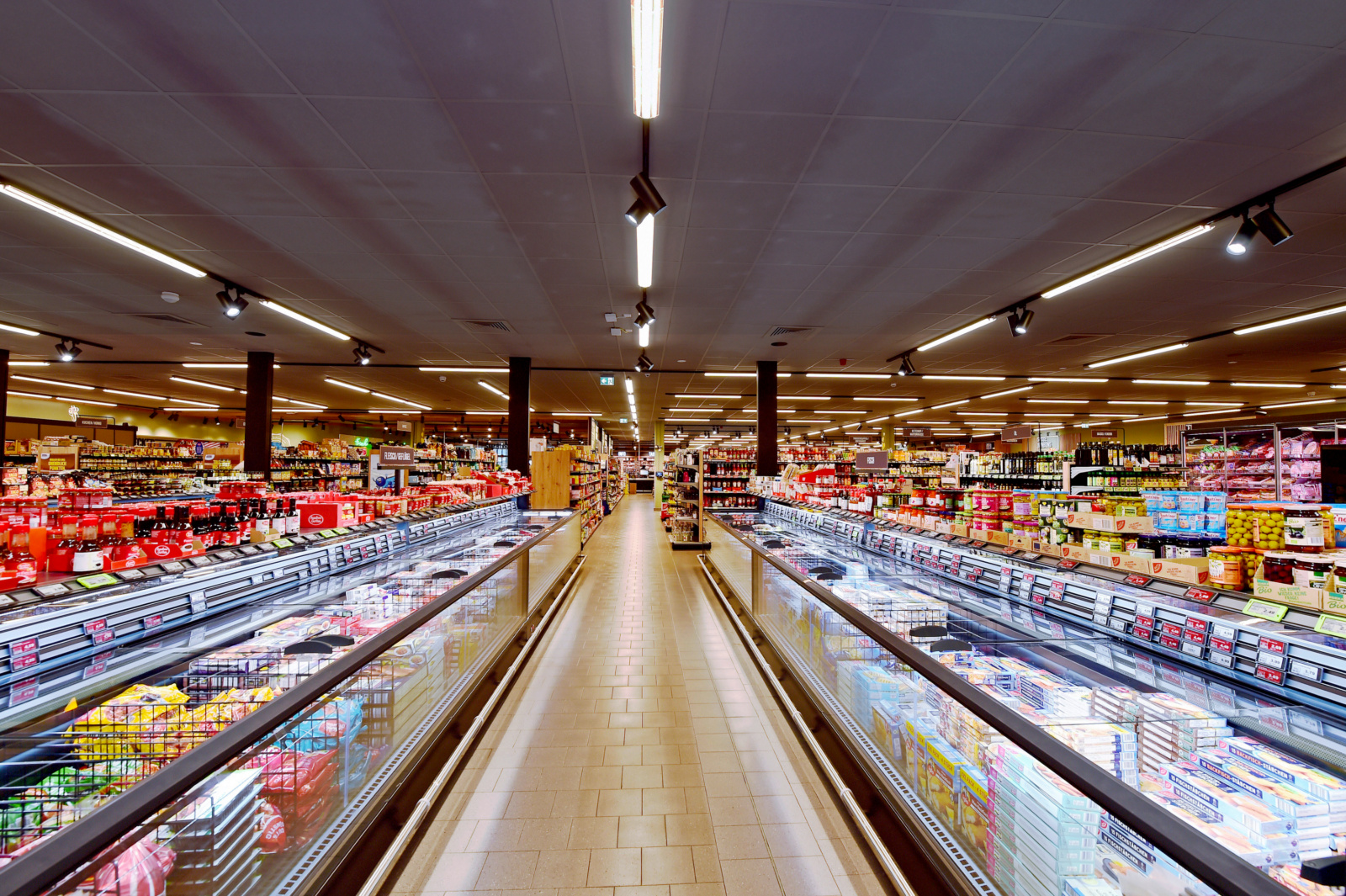 Die LINEAR PRO FOLD 3-Phasen Stromschienenleuchte ist die ideale Lösung für die Beleuchtung von Verkaufsregalen. Durch ihre spezielle Optik eignet sie sich hervorragend für die Beleuchtung von Regalgängen. Damit ist sie in der Lage, typische Anwendungsszenarien auf beiden Seiten des Ganges über die gesamte Höhe gleichmäßig auszuleuchten. Gleichzeitig sorgt der diffuse Lichteinsatz in der Mitte für eine gleichmäßige Ausleuchtung des Ganges selbst.