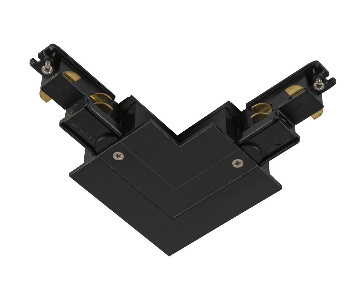 Eckverbinder für das S-TRACK Hochvolt 3Phasen-Einbauschienen-System. Der schwarze Verbinder ist mit Erdleiter links erhältlich. Detaillierte Informationen entnehmen Sie bitte der Planungshilfe.