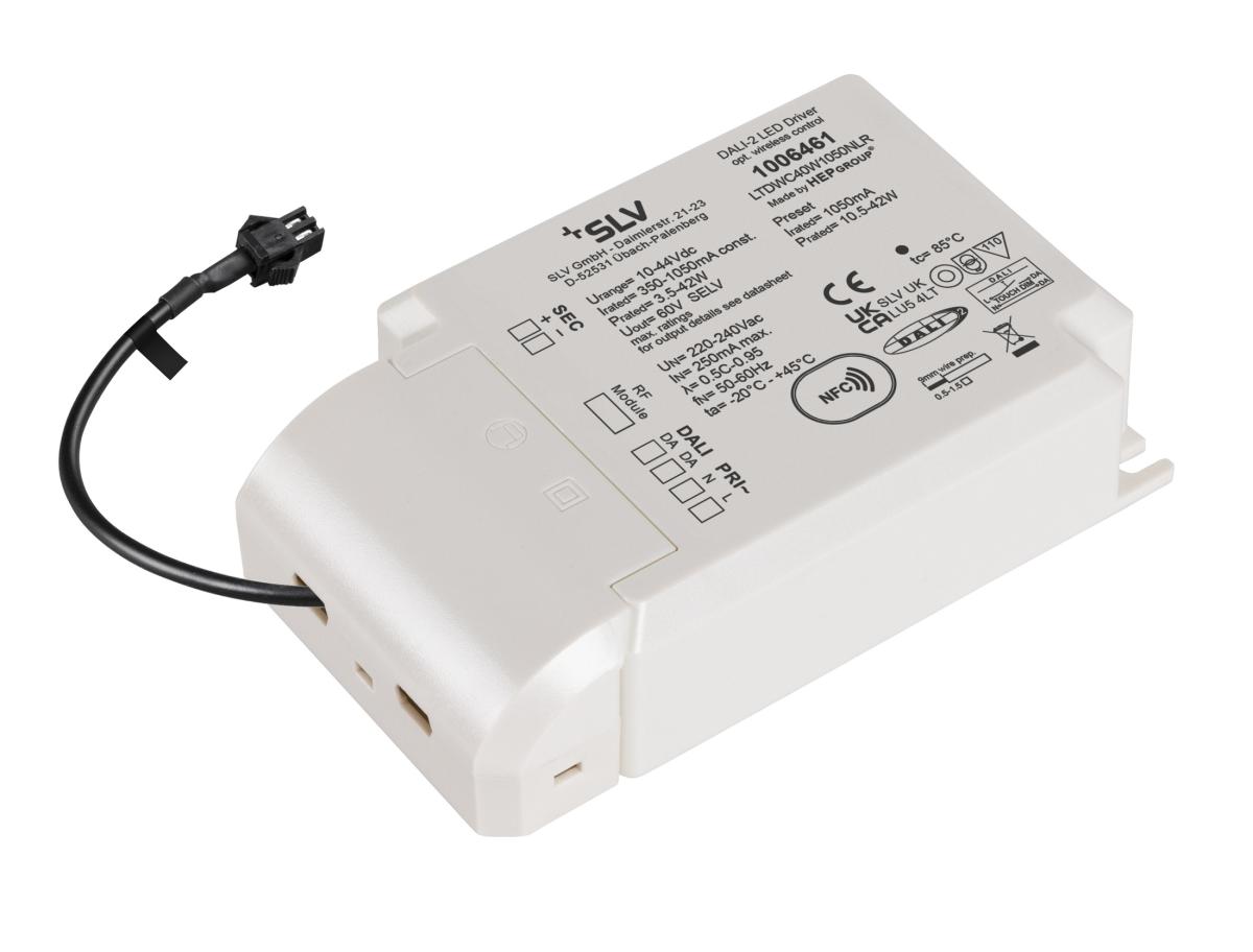 Dimmbarer DALI LED-Bridge-Treiber mit 700 mA Konstantstrom und einer Leistung von 42 Watt inklusive Funkschnittstelle für das RF Modul wahlweise mit Zigbee oder Casambi. Der Anschluss der LEDs muss in Reihenschaltung erfolgen.