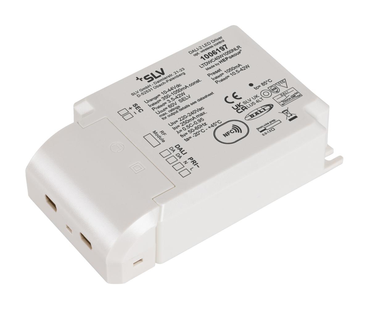 Dimmbarer DALI LED-Treiber mit 1050 mA Konstantstrom und einer Leistung von 40 Watt inklusive RF-Schnittstelle. Der Anschluss der LEDs muss in Reihenschaltung erfolgen.