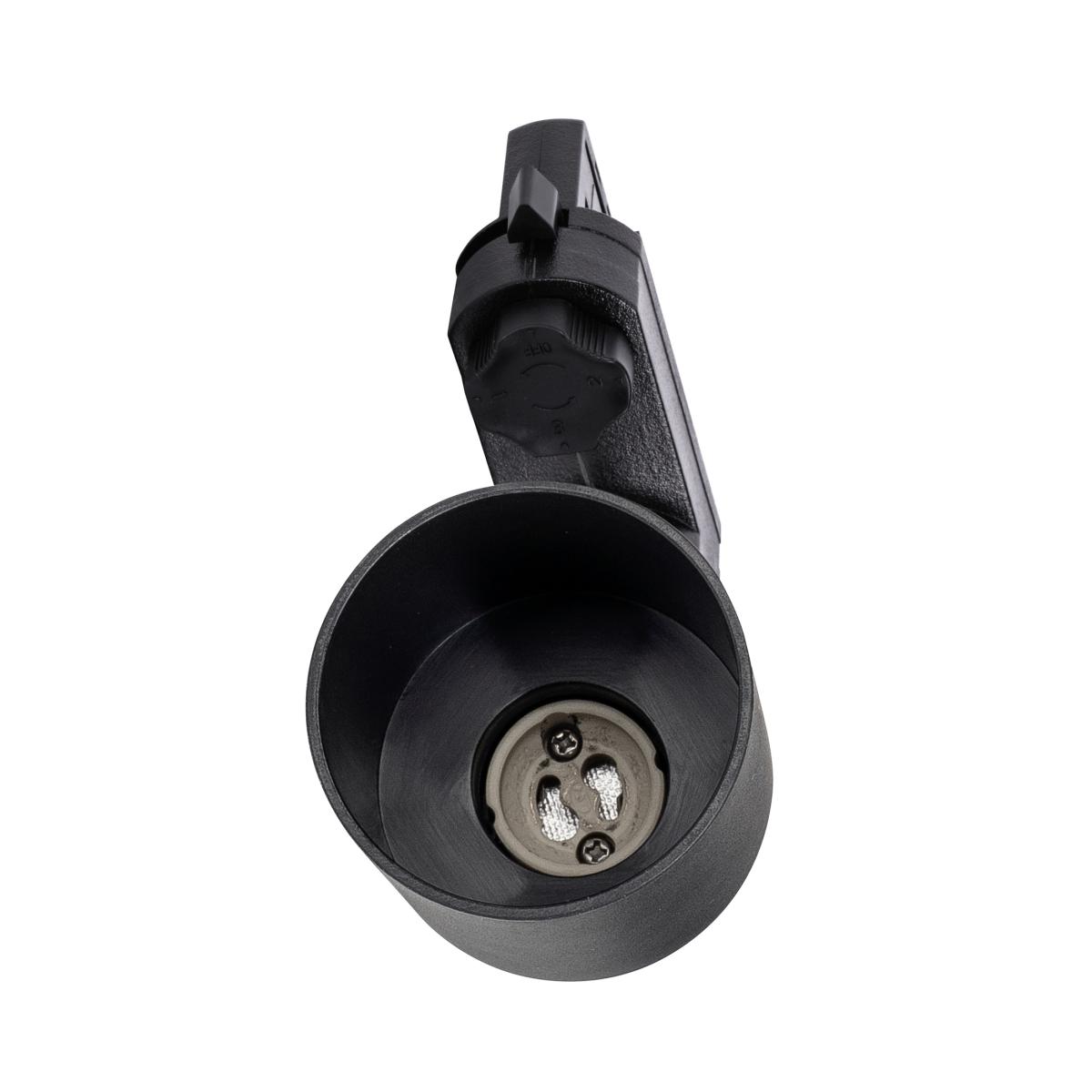 Dreh- und schwenkbarer Hochvoltstrahler PURI TRACK mit passendem Adapter für das 3Phasen Hochvolt-Schienen-System. Die aus Aluminium gefertigte Leuchte ist durch den verbauten GU10 Sockel für Halogen- sowie LED-Leuchtmittel geeignet.