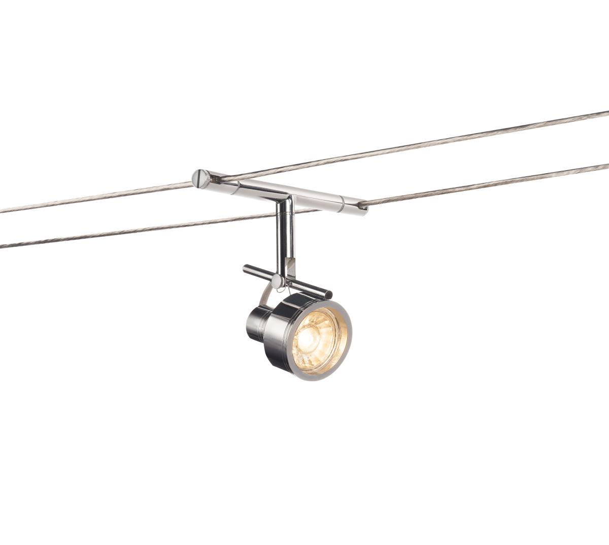 Aus Stahl bestehender, dreh- und schwenkbarer Strahler SALUNA für das Niedervolt Seilsystem. Durch den verbauten G5,3 Sockel ist der Strahler für Halogen- sowie LED-Leuchtmittel geeignet. Der maximal kompatible Seilabstand beträgt 15,5 cm.